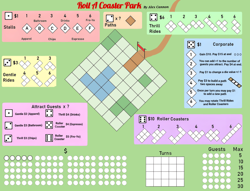 Roll your way to fun in this Roller Coaster Park building roll and write game.